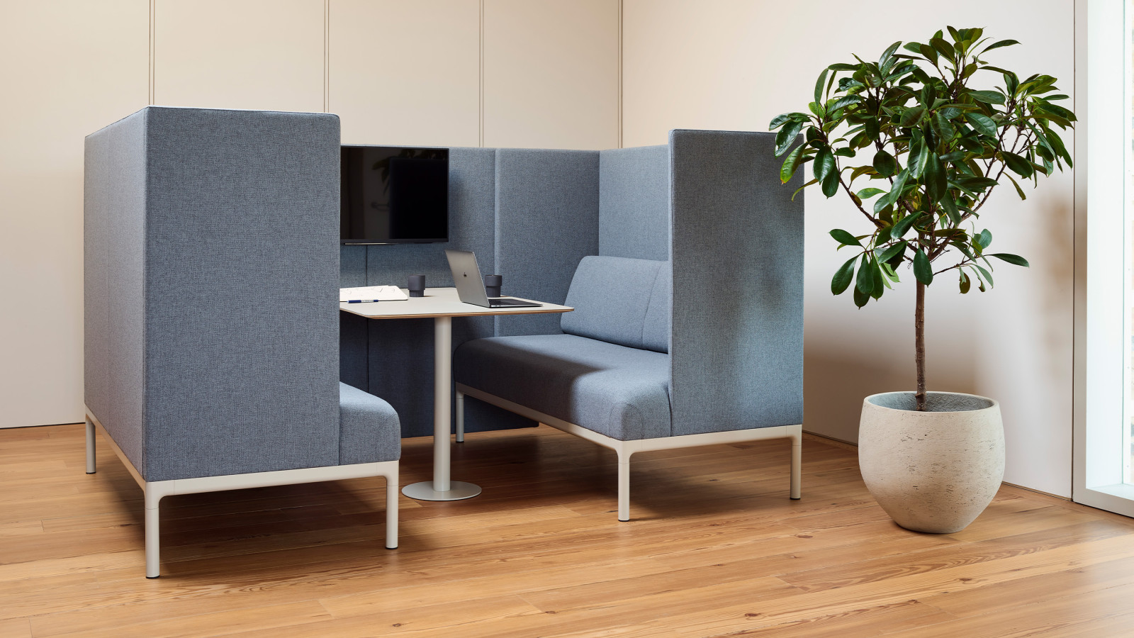 Take refuge from a lively office environment and find a quiet space to focus with the Pearson Lloyd Edge booth. Coordinating with all pieces in the Pearson Lloyd Edge portfolio, the booths form part of a cohesive collection that shares the universal aluminium frame. Offering the highest degree of privacy with its precisely upholstered surround, the booth is available as a single, two, four and six-person booth with or without power and with optional media capability. Consistently popular since its launch, the Pearson Lloyd Edge booth is ideal for open plan work spaces and study zones.