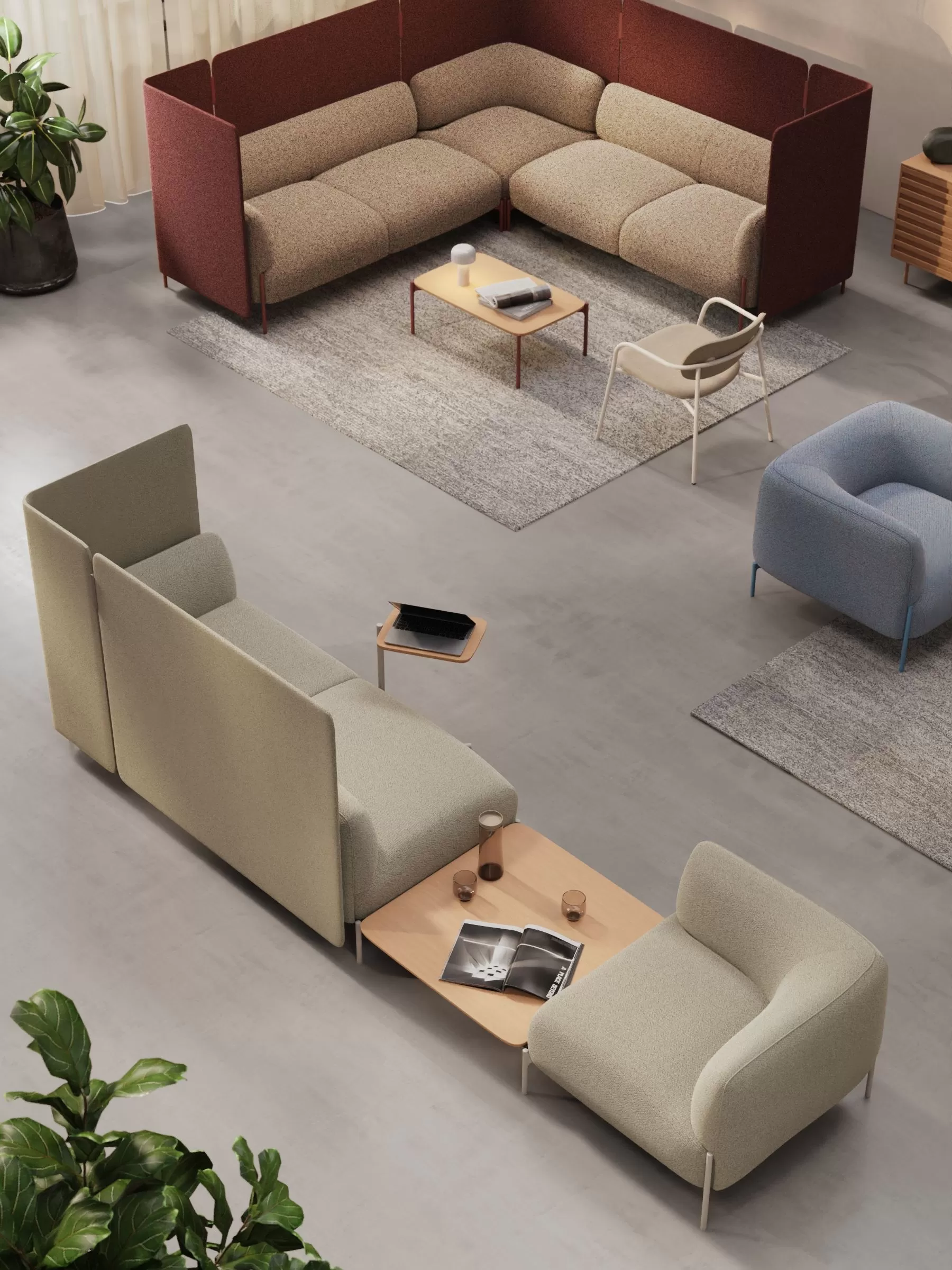 Monica Förster's Panda System goes beyond ordinary seating. Its softly sculpted forms and modular versatility empower users to craft dynamic workspaces that adapt to every need. From collaborative hubs to private retreats, Panda offers flexibility by seamlessly incorporating chaise longues, privacy screens, and integrated tables for breakout lounge settings, or take it a step further by creating configurations with working height surfaces for individual drop in focus spaces or meeting booths.